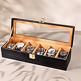 Watch Box Organizer – 6 Slot Display Case with Glass Lid, PU Leather, Soft Velvet Interior – Elegant Storage for Men’s & Women’s Watches, Jewelry & Accessories – Gift-Ready Case, Black