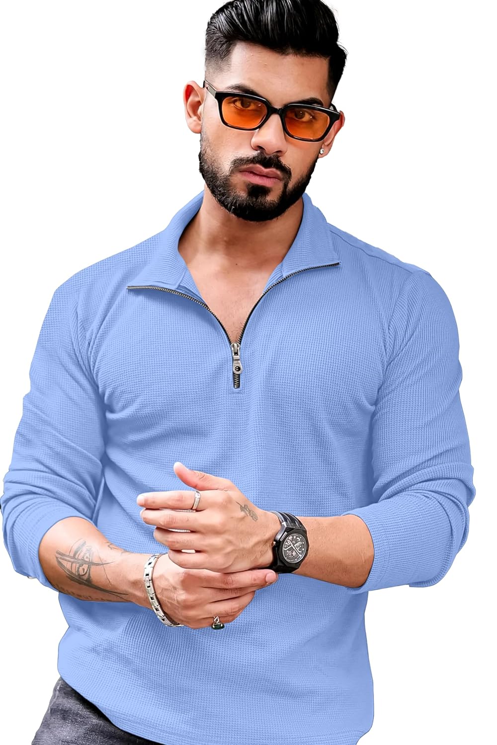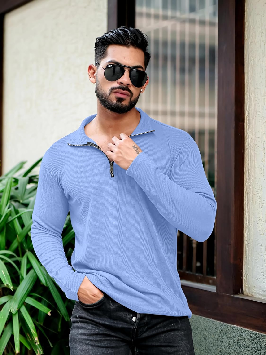 Elevate your casual wardrobe with this sophisticated quarter-zip waffle knit polo t-shirt. The distinctive waffle texture adds depth and character to the design, while the quarter-zip collar offers versatile styling options. Crafted in full sleeves, this polo shirt combines comfort with contemporary fashion. Available in classic black, sophisticated khaki, and stylish pink colours, it’s perfect for various occasions. The fitted silhouette creates a polished look, while the textured fabric ensures breathability and comfort throughout the day. The premium zip closure features a durable metal pull, adding a touch of refinement. This versatile piece pairs excellently with jeans, chinos, or formal trousers, making it suitable for both casual outings and smart-casual settings. The ribbed cuffs and collar maintain their shape, ensuring long-lasting wear. The waffle knit pattern not only adds visual interest but also provides additional comfort and texture. Perfect for year-round wear, this polo t-shirt is a must-have addition to any modern gentleman’s wardrobe.