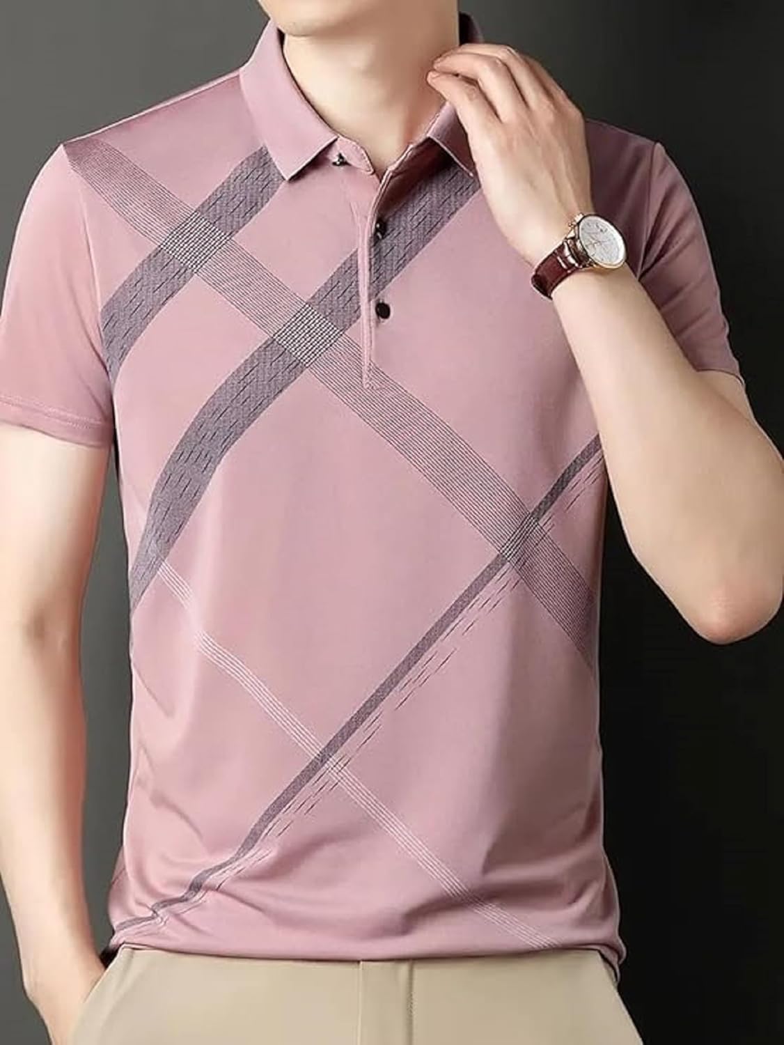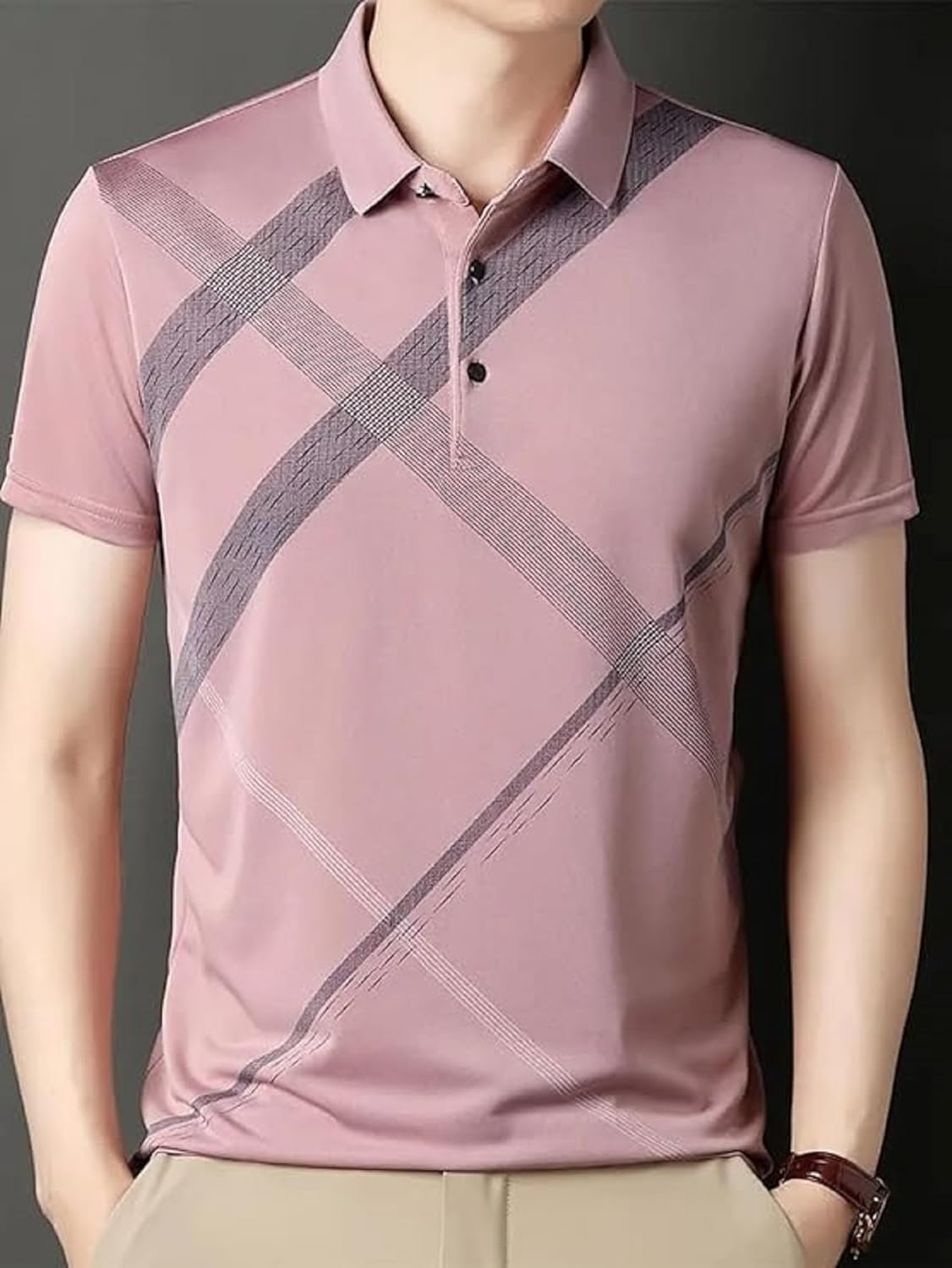 Customers find this polo shirt to be of good quality with breathable fabric and a nice fit, particularly noting it’s not too loose. The shirt features a stylish design, with one customer highlighting its diagonal checkered pattern, and customers appreciate its comfort and value for money. They like its color, with one mentioning its unique soft pink shade, and find it suitable for both casual and formal occasions.