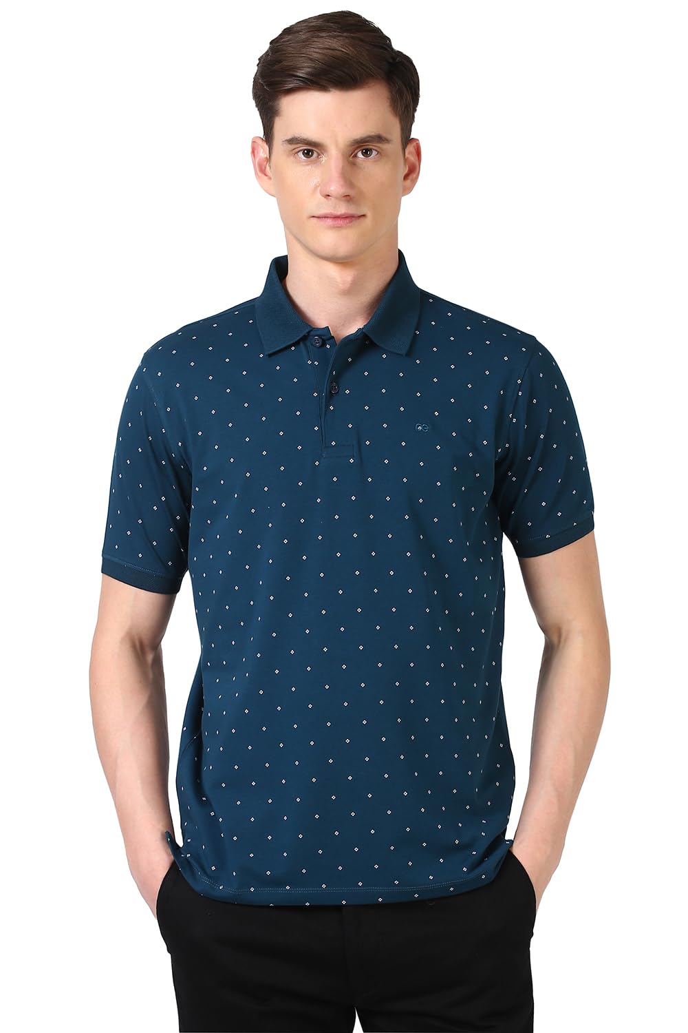 This Blue Polo Neck Half Sleeves T-shirt from Peter England is made from 95% Cotton and 5% Spandex. Fashioned in Regular Fit it features a Print design.