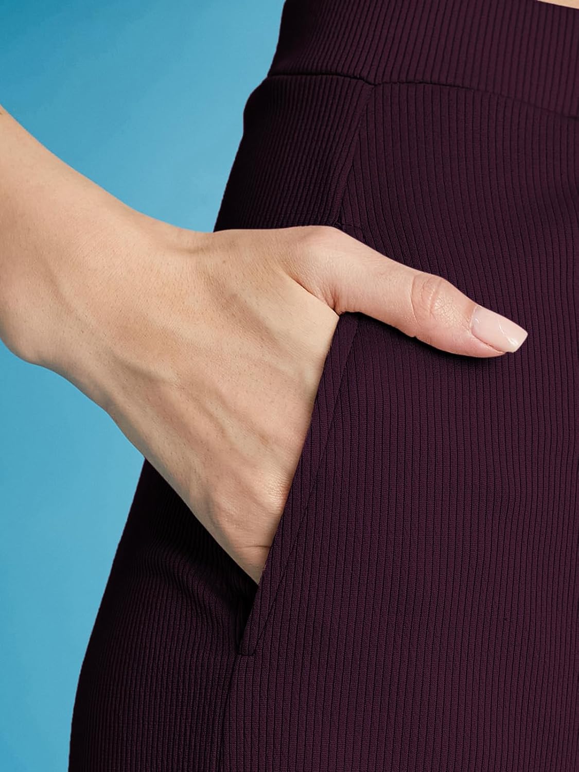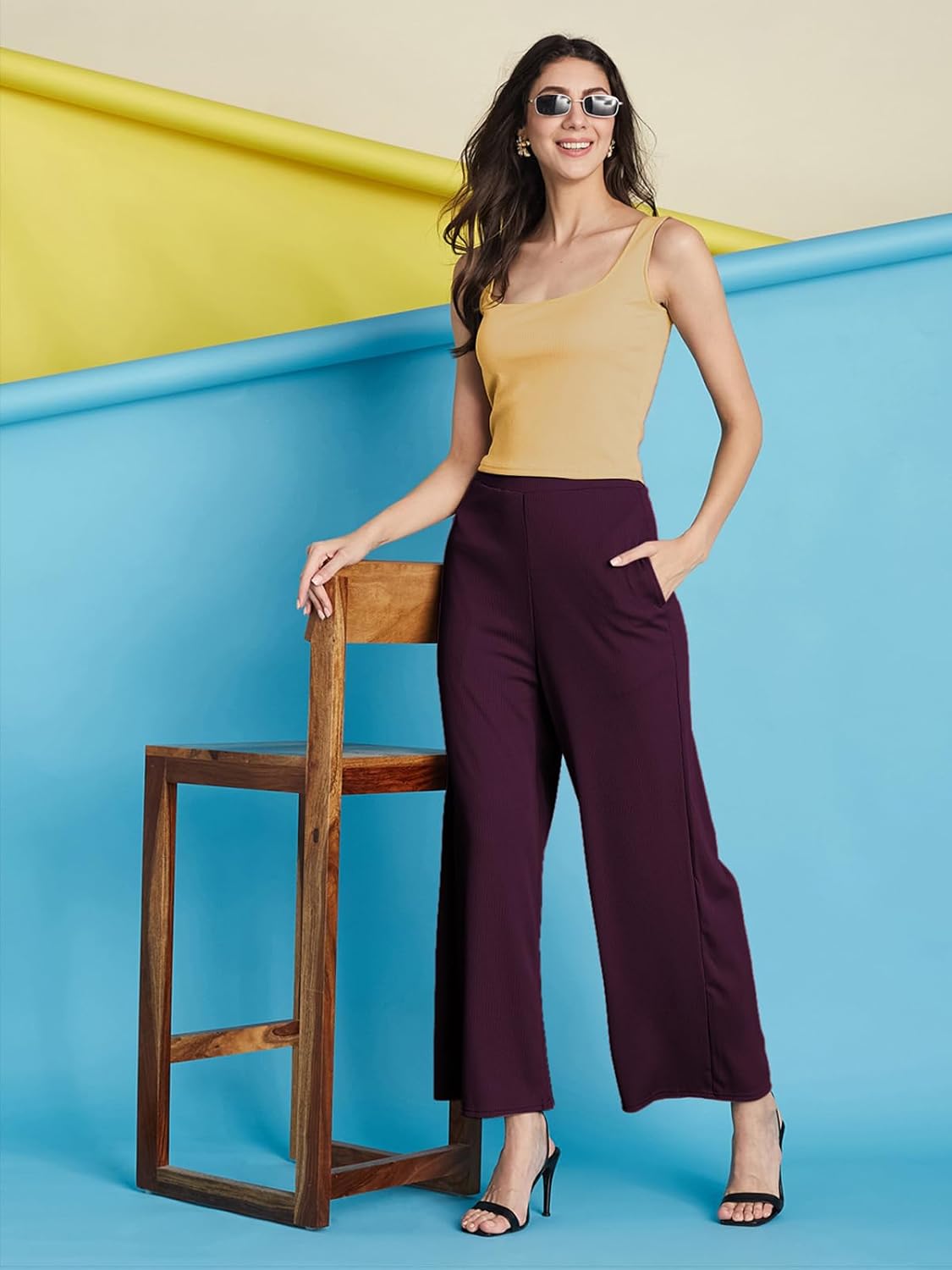 Selvia Women’s Solid Ribbed Lycra Elastic Regular Fit Wide-Leg Trouser